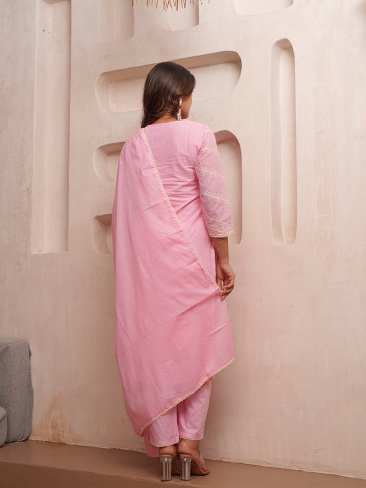 Cotton Floral Embroidered with Lace Detailed Pink Kurta Pant & Dupatta
