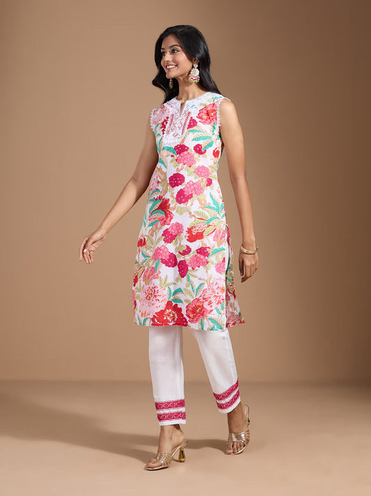 Cotton Schiffli Floral Printed V-Neck Straight Kurta With Trousers & Dupatta