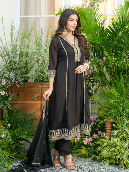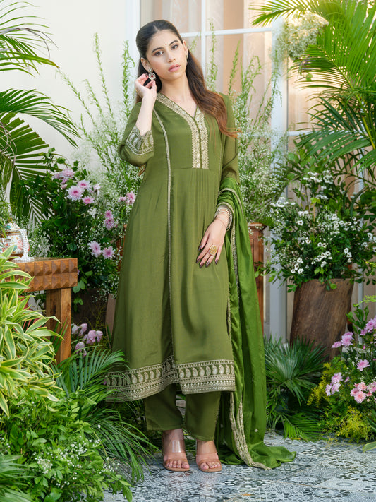 Embroidered V-Neck Chinon Kurta with pant Set and Chiffon Dupatta