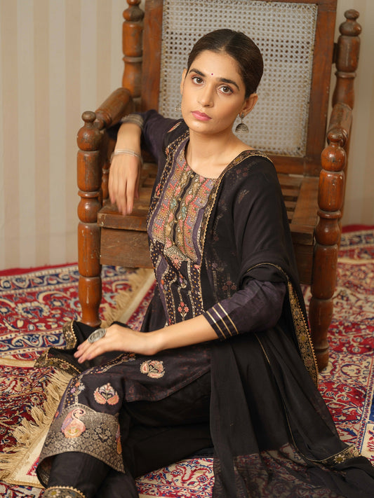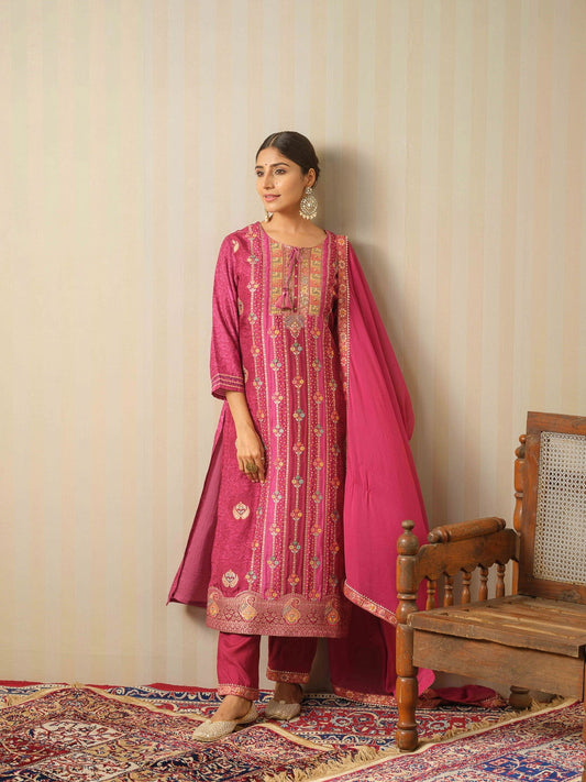 Ethnic Motifs Embroidered Pure-Silk Kurta With Trousers & Dupatta