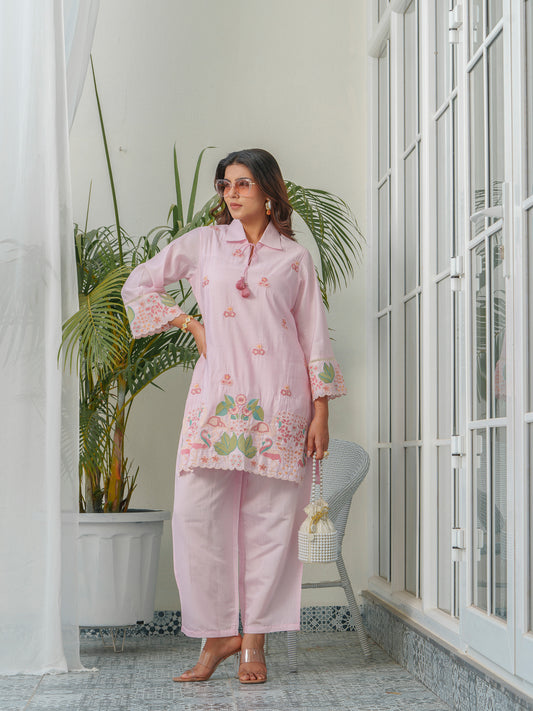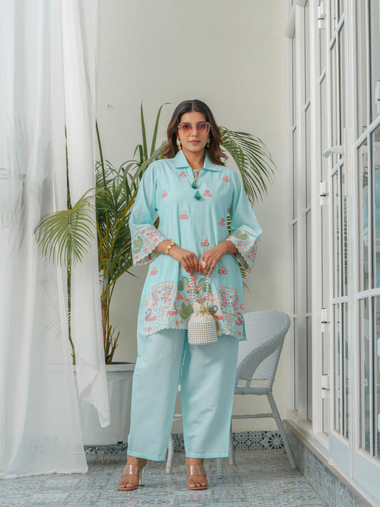 Floral & Swan Embroidered Tunic & Trousers Co-Ords