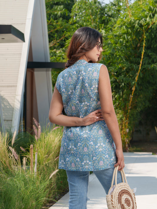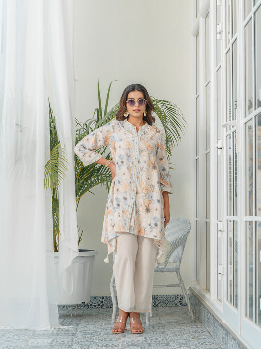Floral Printed Mandarin Collar Linen Tunic & Trousers