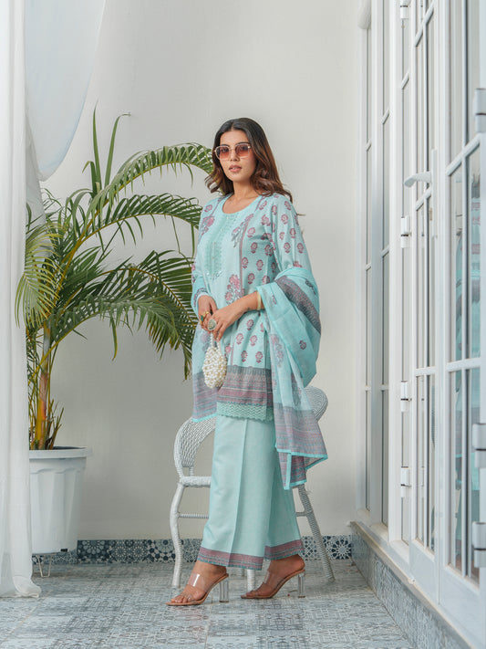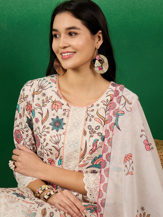 Floral Printed Cotton Round Neck Straight Kurta With Trousers & Dupatta