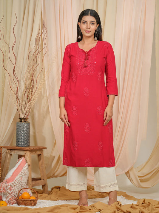 Floral Embroidered Tie-Up Neck Sequined Straight kurta