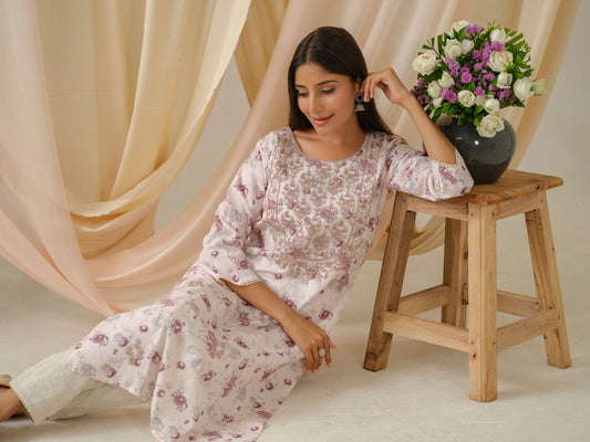 Off-White Floral Yoke Design Thread Work Straight Kurta
