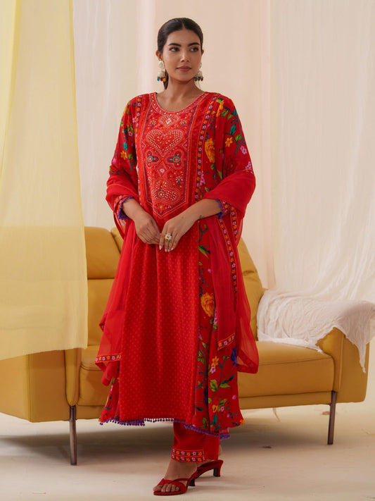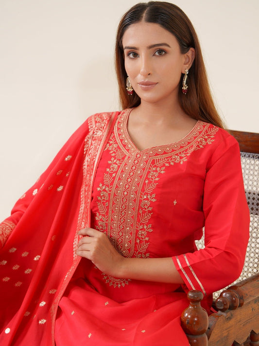 Natural Crepe Red Color Embroidered Kurta With Trousers & Dupatta