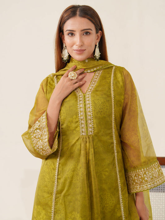 Poly Organza Green Color Woven Design Kurta With Trousers & Dupatta