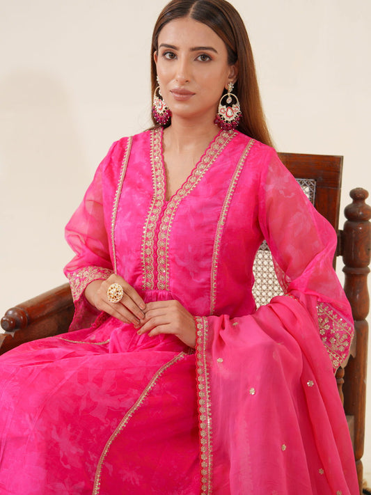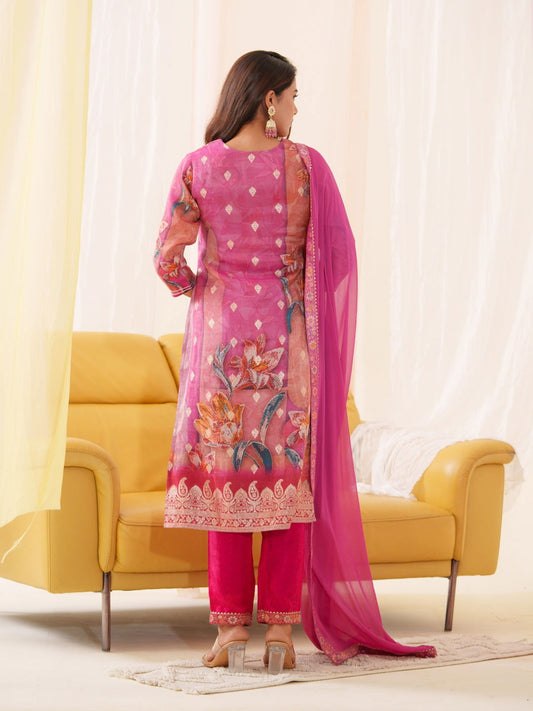 Poly Organza Pink Color Woven Design Kurta With Trousers & Dupatta