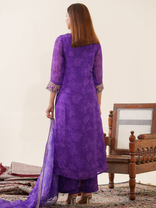 Poly Organza Purple Color Ethnic Motifs Embroidered Kurta With Trousers & Dupatta