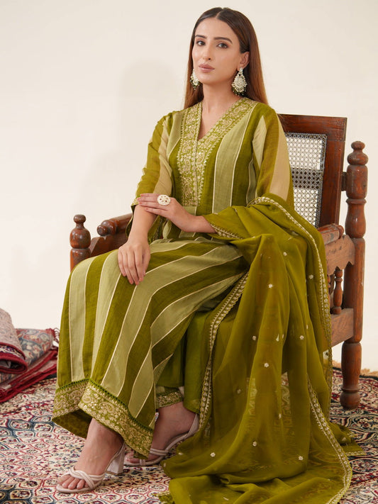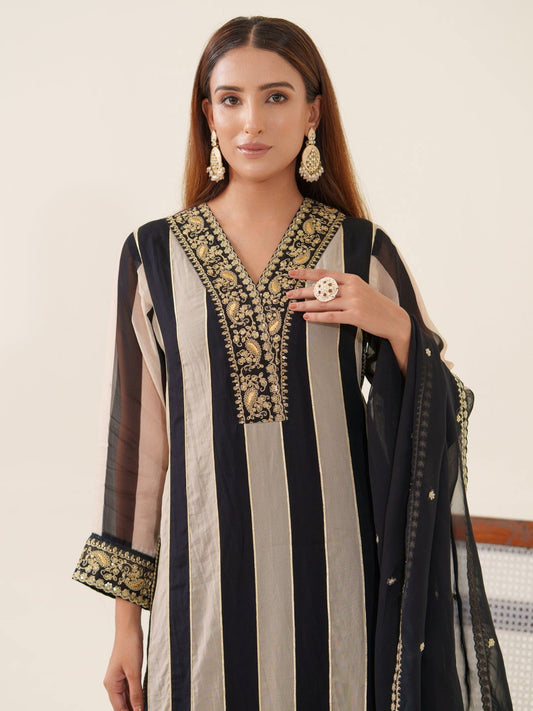 Poly Organza Striped With Embroidered Kurta With Trousers & Dupatta