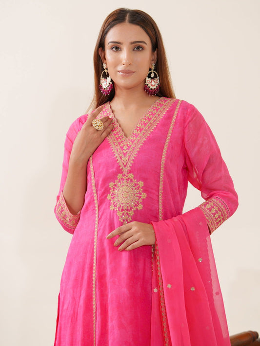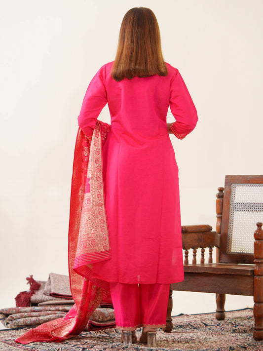 Roman Silk Pink Color Ethnic Motifs Embroidered Kurta With Trousers & Dupatta