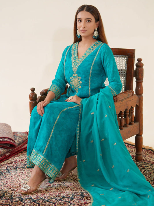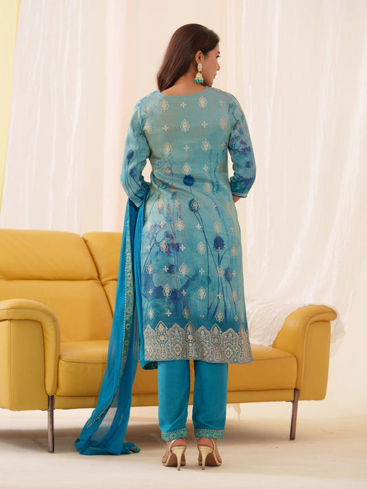 Shimmer Blue Color Woven Design Kurta With Trousers & Dupatta