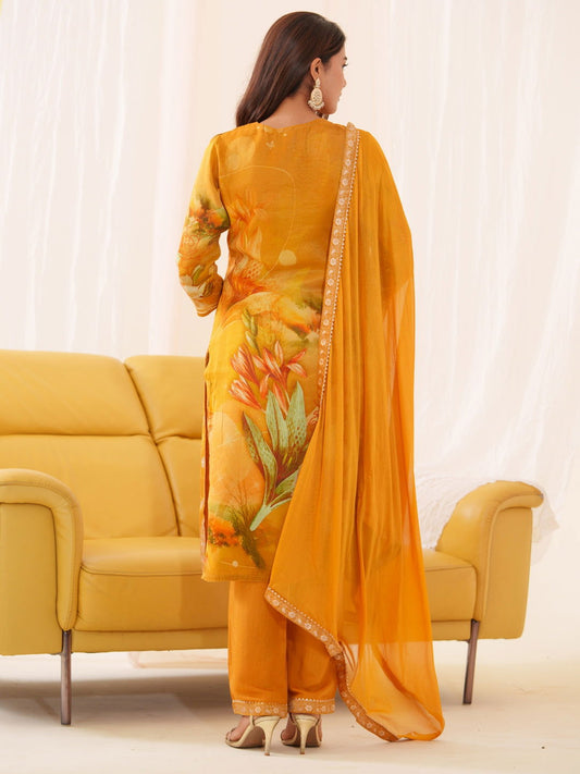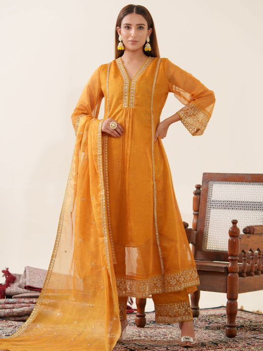 Poly Organza Yellow Color Woven Design Kurta With Trousers & Dupatta