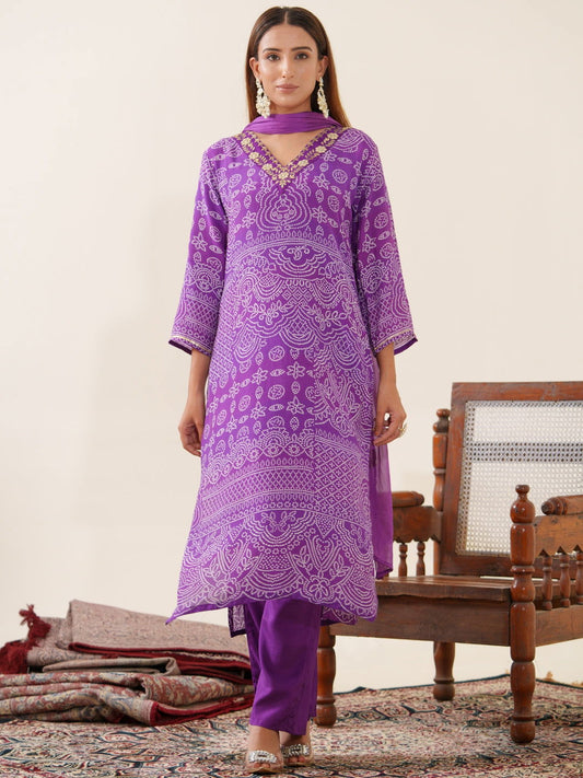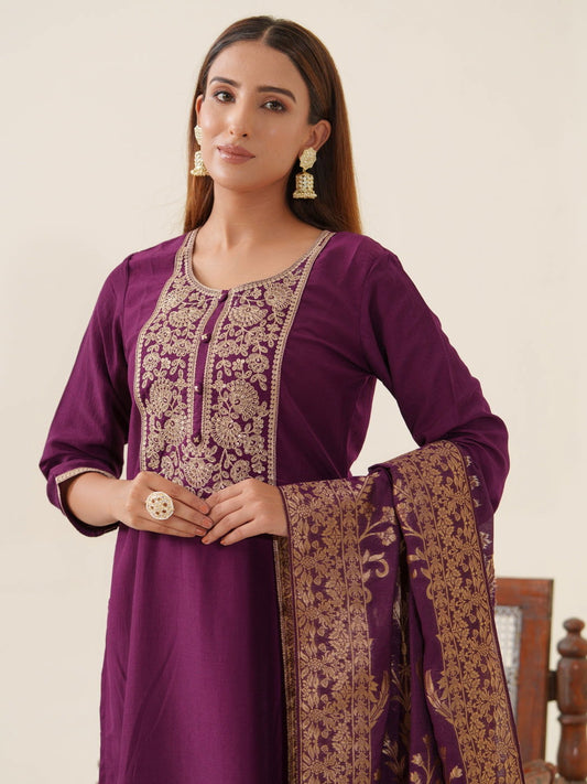 Pure Muslin Purple Color Ethnic Motifs Woven Design Regular Kurta with Trousers & Dupatta
