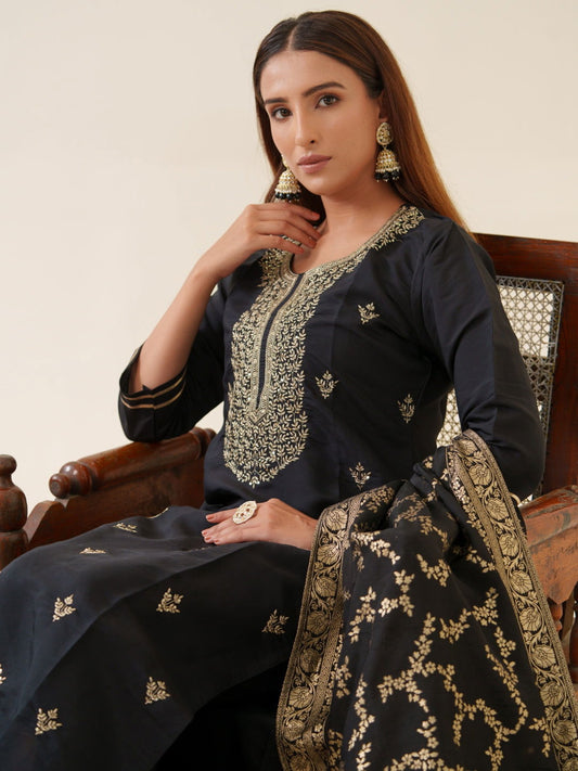 You save 67%Roman Silk Black Color Kurta Set with Dupatta
