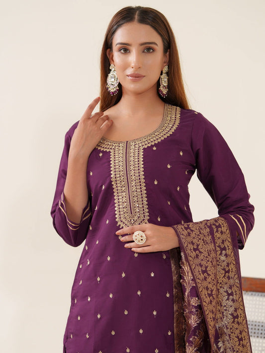 Wine Color Poly Chinon Ethnic Motifs Woven Design Zari Regular Kurta with Trousers & Banarasi Dupatta