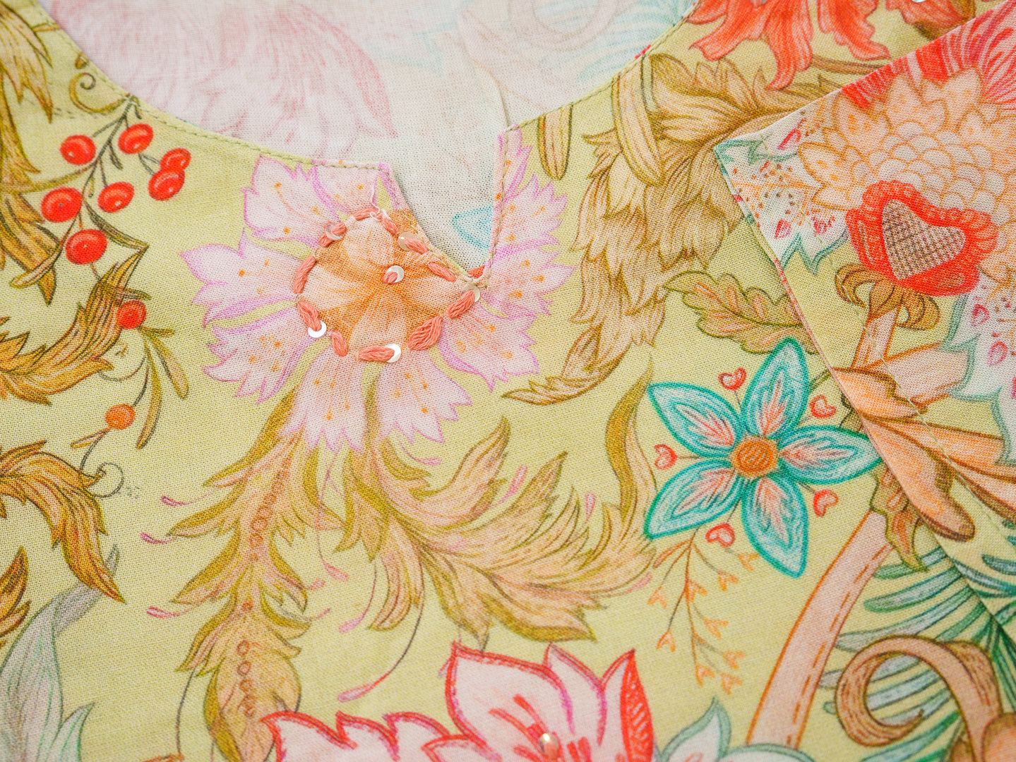 Elevate your ethnic wardrobe with this elegant printed kurta set. The kurta features a refreshing pastel floral print with a straight fit silhouette, three-quarter sleeves, and a simple round neckline, perfect for both casual and semi-formal occasions.