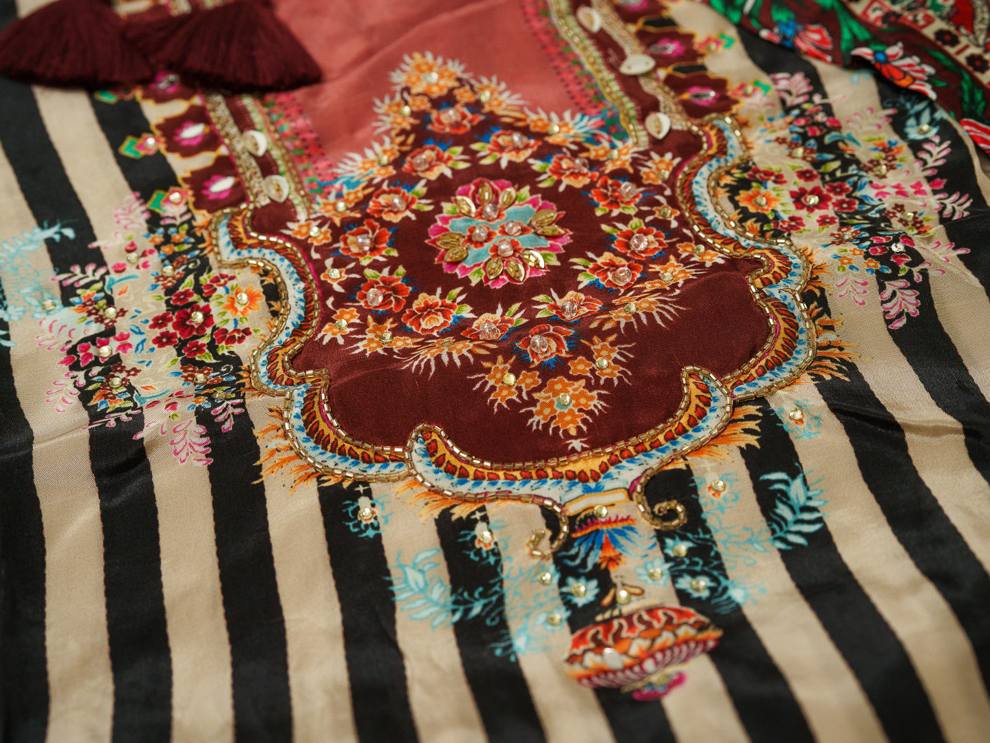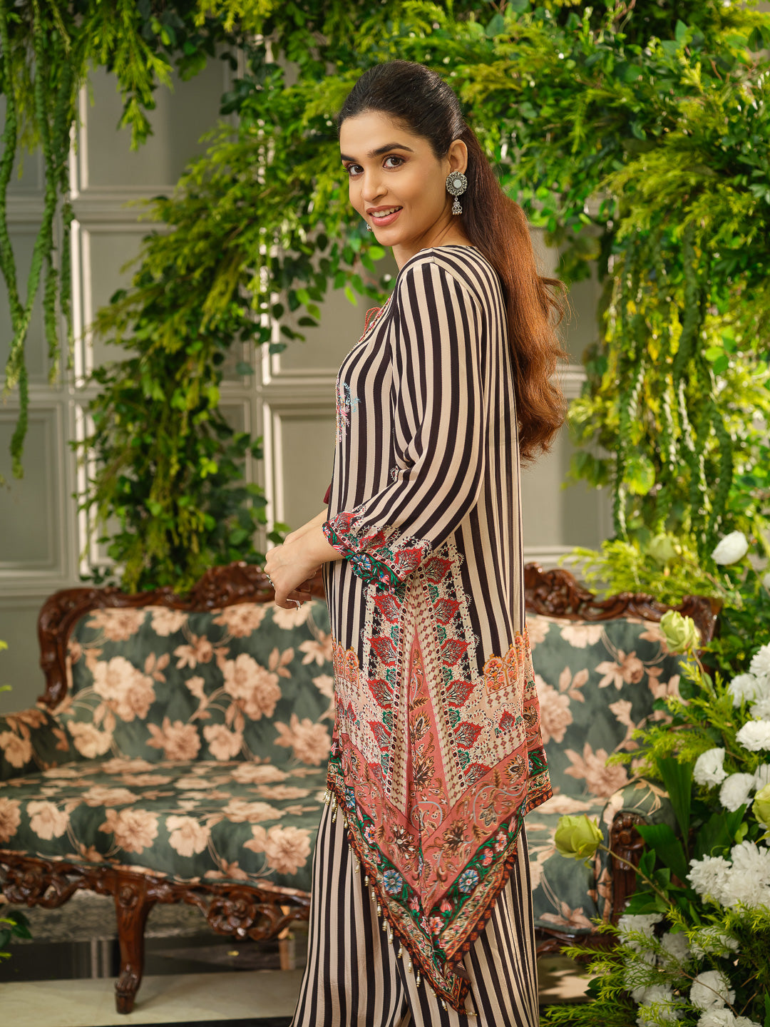 Crafted from natural crepe silk, this black and pink striped co-ord set features a fish-cut and C-cut kurta with a tie-up neck. It's adorned with intricate handwork and a digital Pakistani print, offering a stylish and comfortable look.