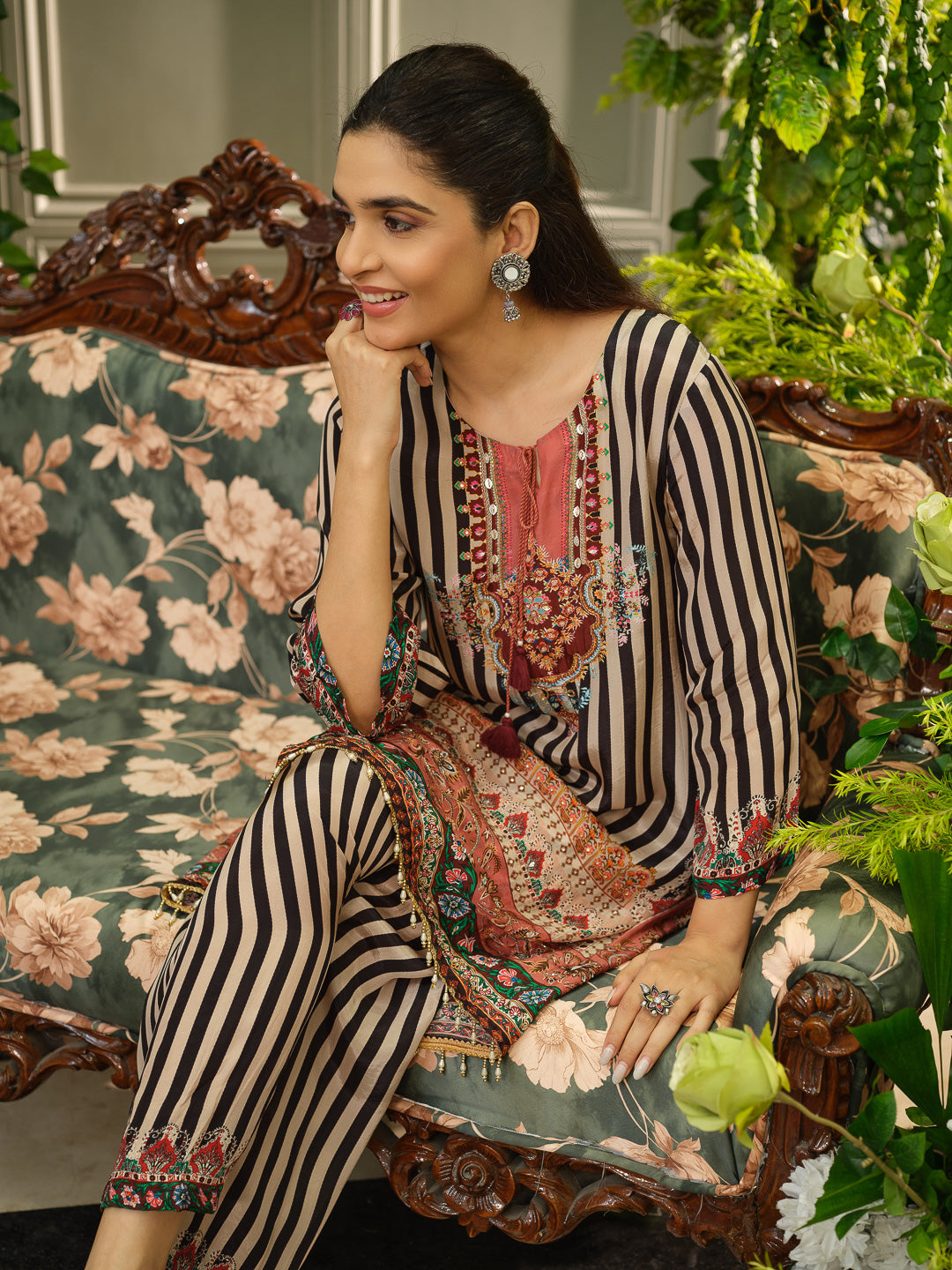 Floral Embroidered Straight Kurta & Trousers With Dupatta