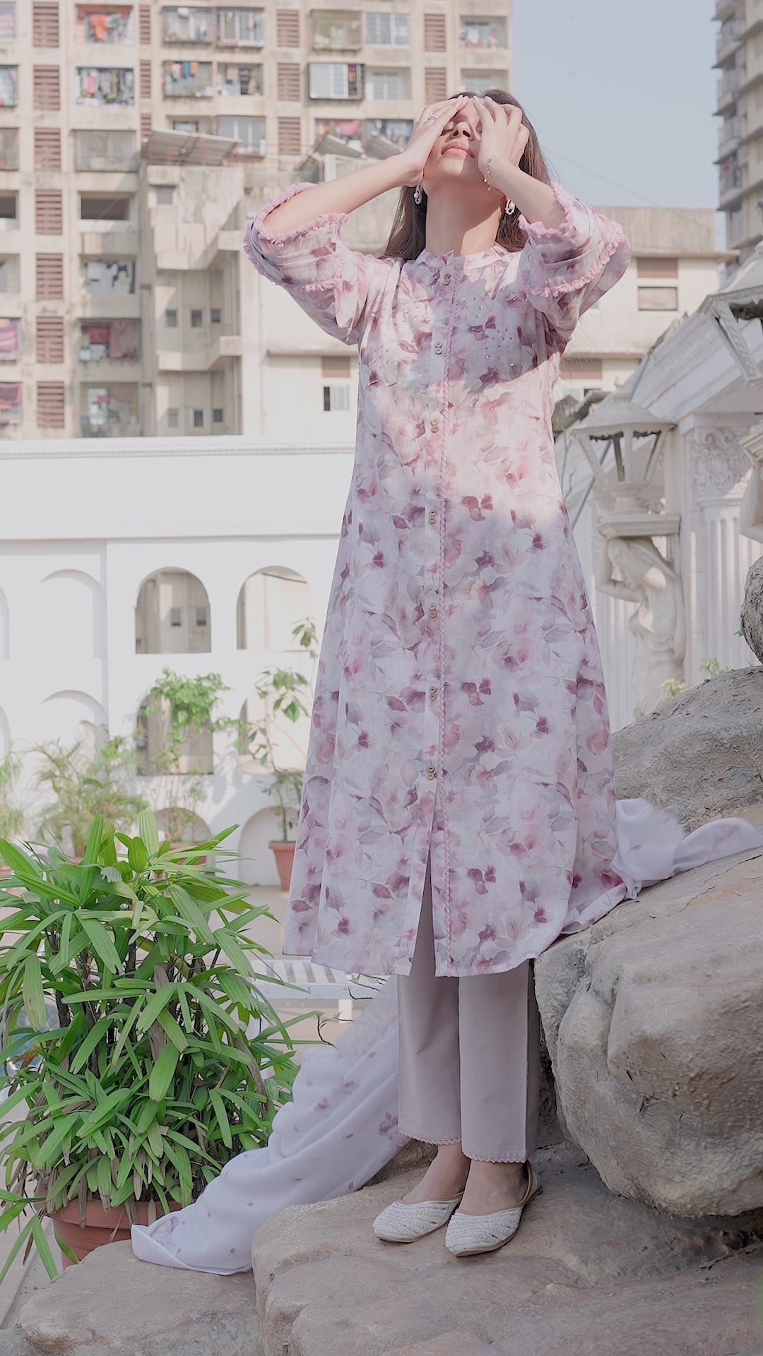 Floral Printed Organza Pleated Anarkali Kurta With With & Dupatta