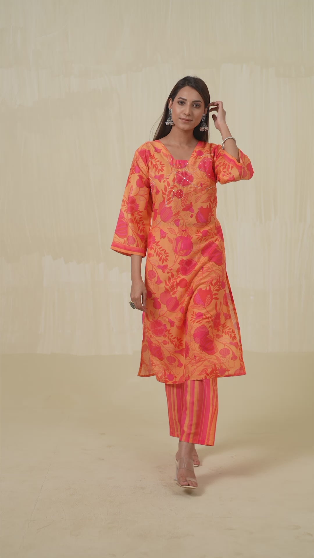 Yellow & Orange-coloured Kurta Floral printed Round neck Three-quarter, regular sleeves Straight shaped Calf-length with straight hem and side slits Machine weave