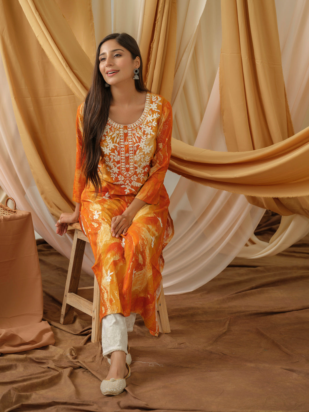 White & Orange Mandarin Collar Printed Tunic Palazzos