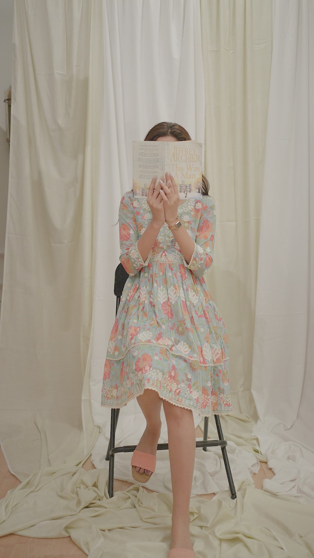 Sky-blue ethnic Dress Floral Printed & embroidered A Line Shaped Round neck Three-quarter regular sleeves Flared hem