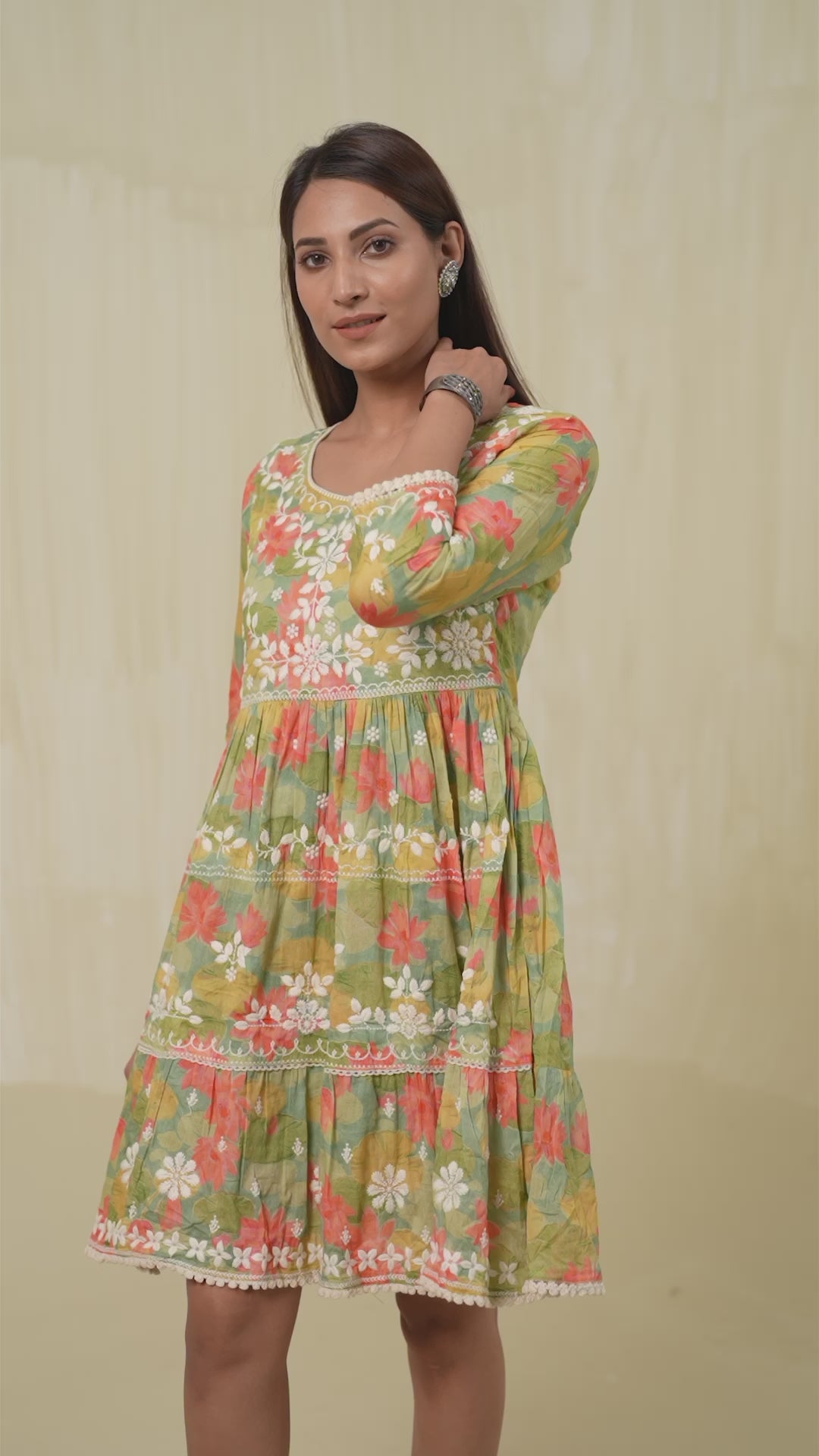 Green and red Floral printed Round neckl Three-quarter regular sleeves Regular design styling Anarkali shape Above knee length with flared hem Machine weave regular cotton