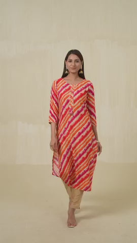 Yellow,orange and brown kurta Leheriya printed Round neck Three-quarter, regular sleeves Regular design styling Straight shape Calf length with straight hem Machine weave regular viscose rayon