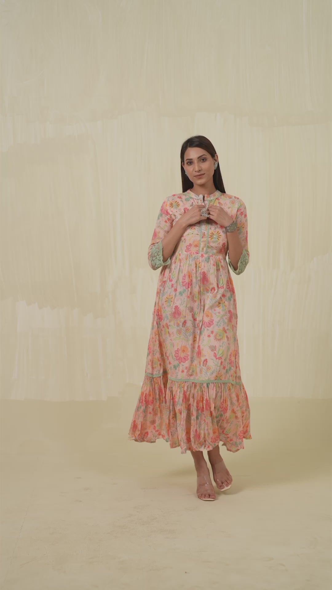 Orange fit & flare ethnic dress Floral printed Fit and flared shape Mandarin neck Three quarter sleeves Flared hem Button closure
