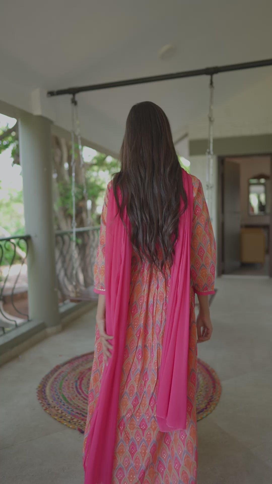 This kurta set consists of kurta, trousers and dupatta Kurta Design Orange, pink kurta Ethnic motifs printed Round neck Three quarter sleeves A Line shaped Calf length with flared hem and no side slits Machine weave Trousers Design: Pink solid trouser solid Eeasticated waistband Slip-on closure Dupatta Design: Pink dupatta Solid