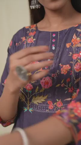 This kurta set consists of kurta and Salwar Kurta Design Purple Kurta Floral printed Boat neck Three Quarter regular sleeves Straight shape Calf-length with side slits and straight hem Machine weave regular silk blend SalwarDesign: Purple solid Salwar Slip on closure