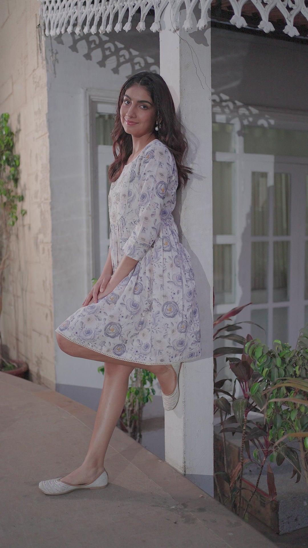 White & blue ethnic Dress Floral printed Empire shaped Round neck Three quarter regular Sleeves Flared hem Slip-on closure