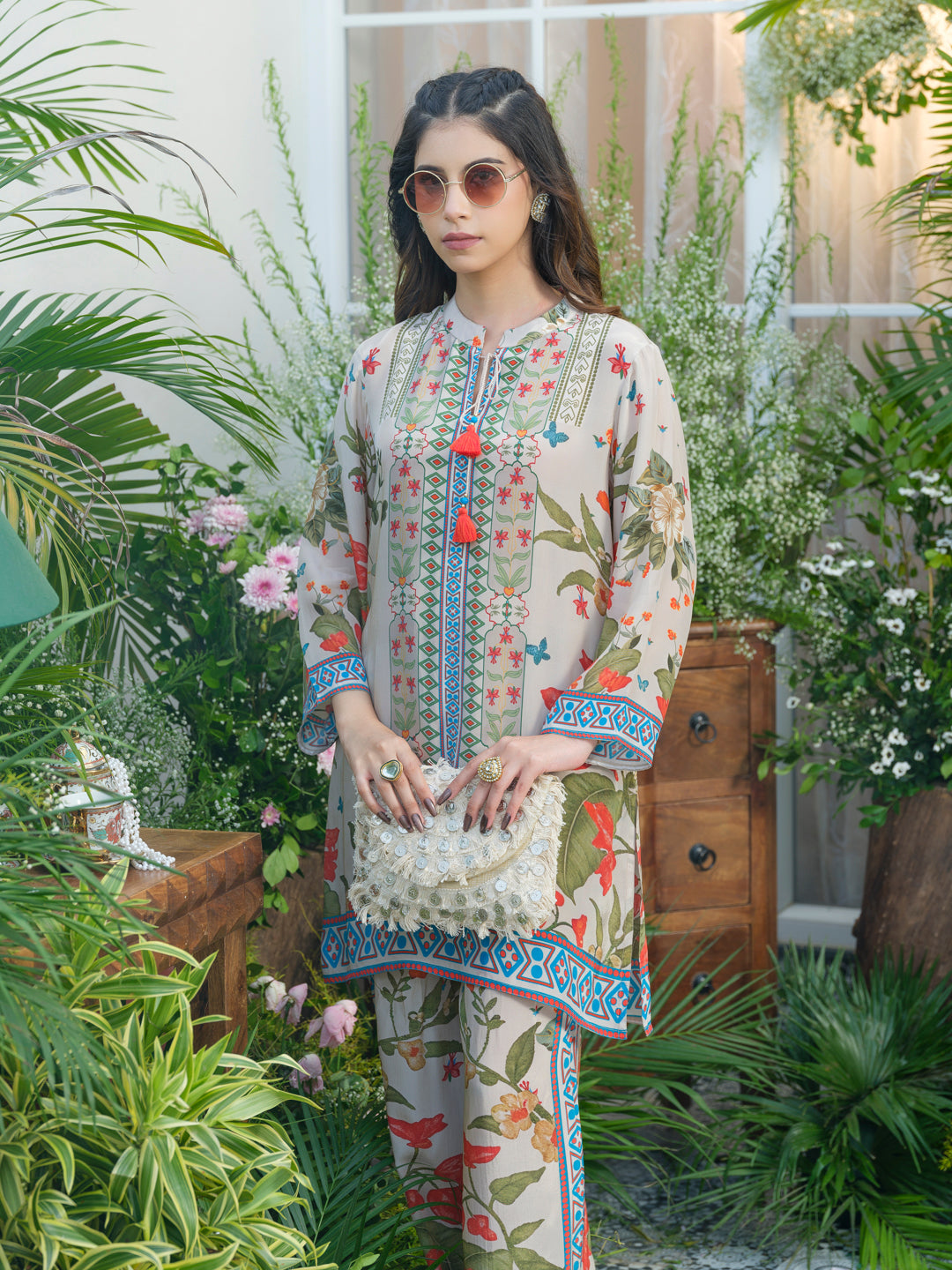 Linen White Printed Floral Straight Kurta and Trousers With Dupatta