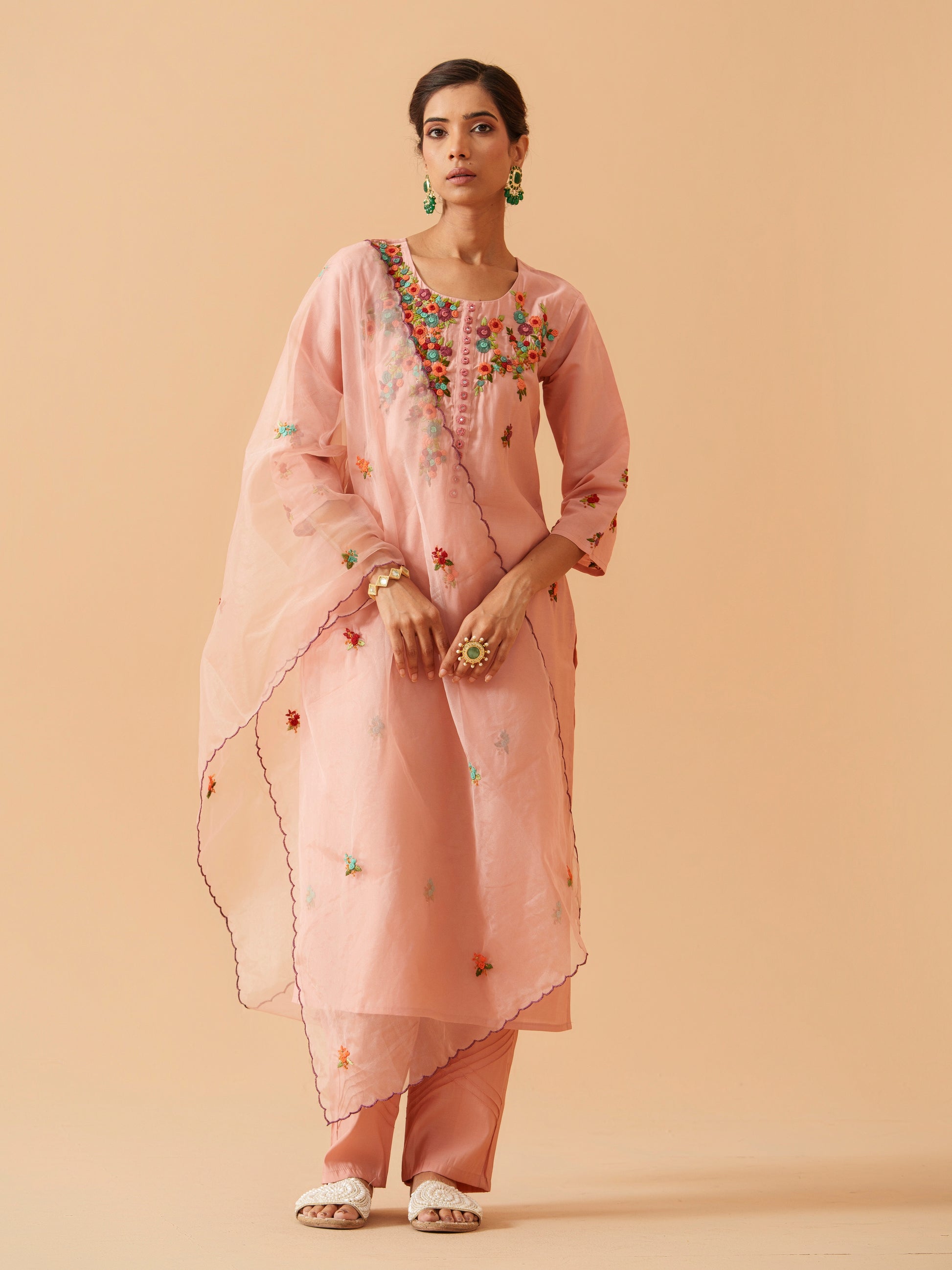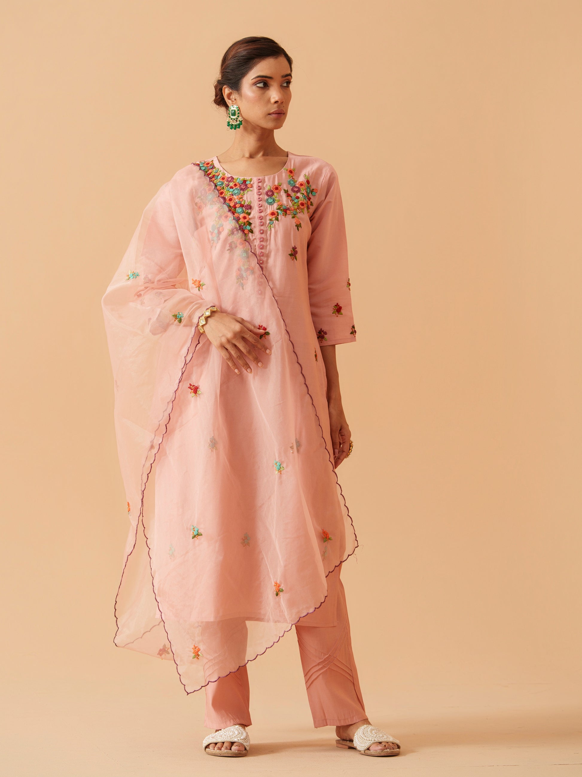 Pink Embroidered Woven Design Straight Kurta and Trousers With DupattaThis outfit is amazing - the embroidery really adds a special touch to the traditional look!