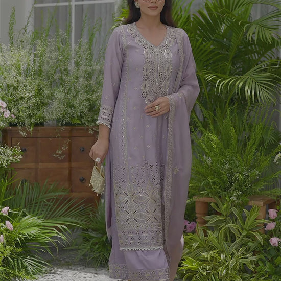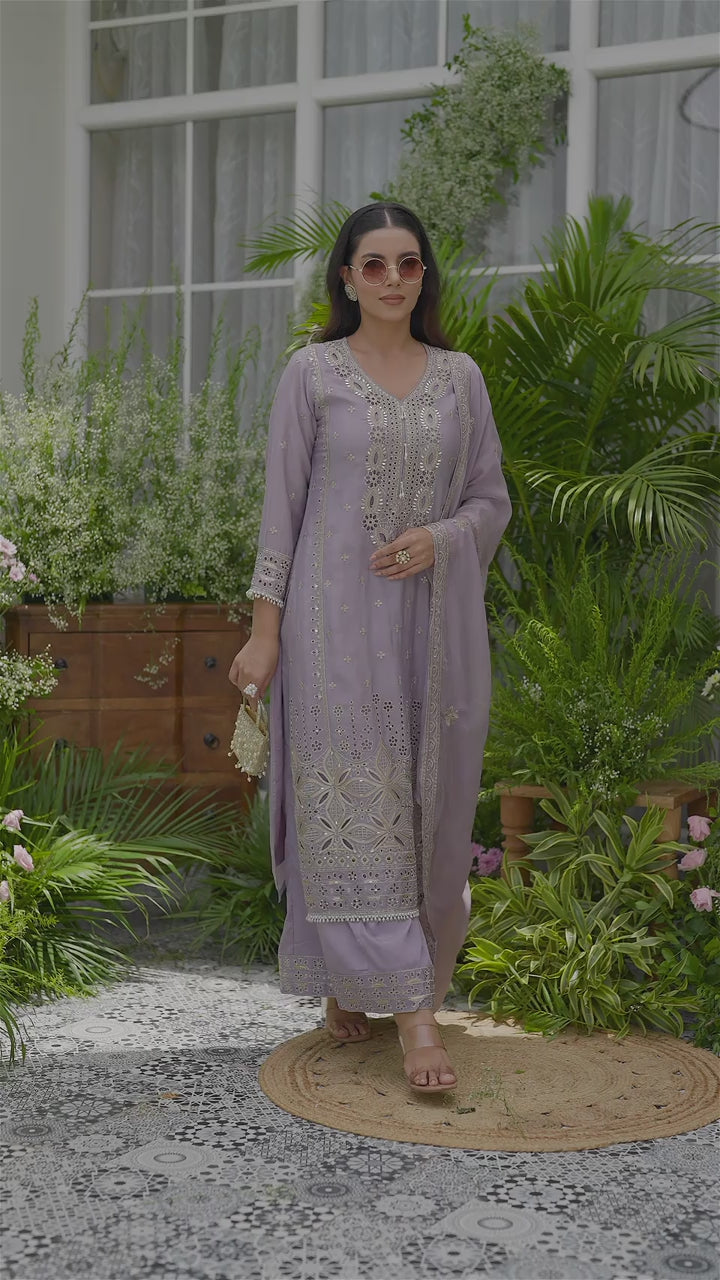 Poly Organza Purple Color Ethnic Motifs Embroidered Kurta With Trousers & Dupatta
