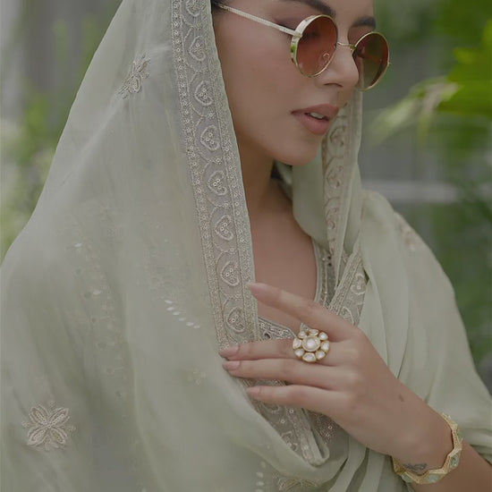 Design your ethnic wardrobe with this beautiful sage green kurta set featuring exquisite Pakistani embroidery, mirror work, cut work, borar work, and delicate moti embellishments.