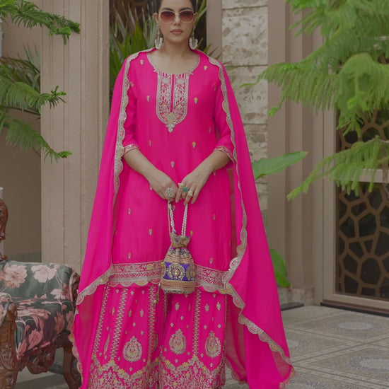 This striking fuchsia pink traditional outfit radiates festive elegance with its detailed embroidery in gold and soft pastel tones.
