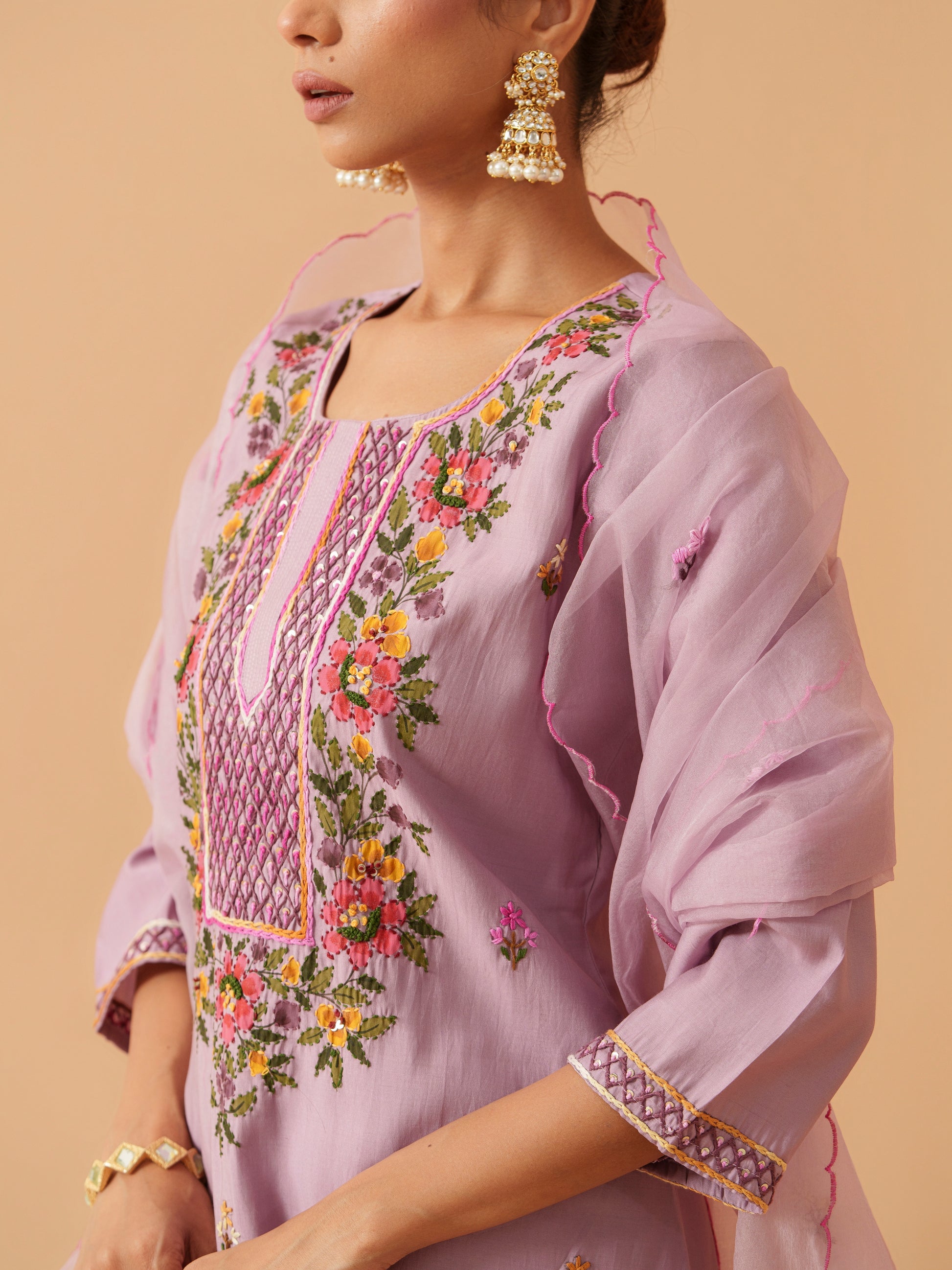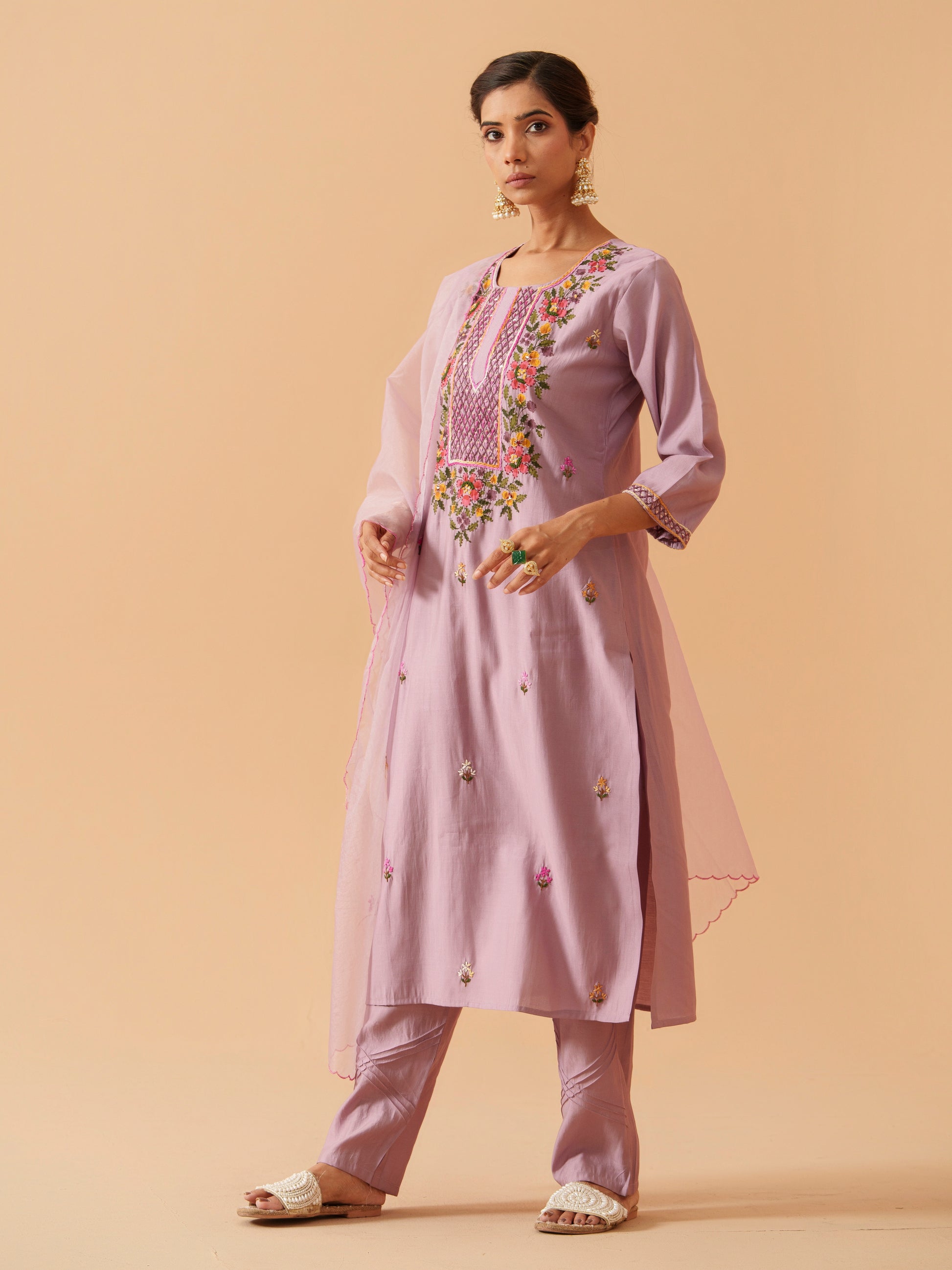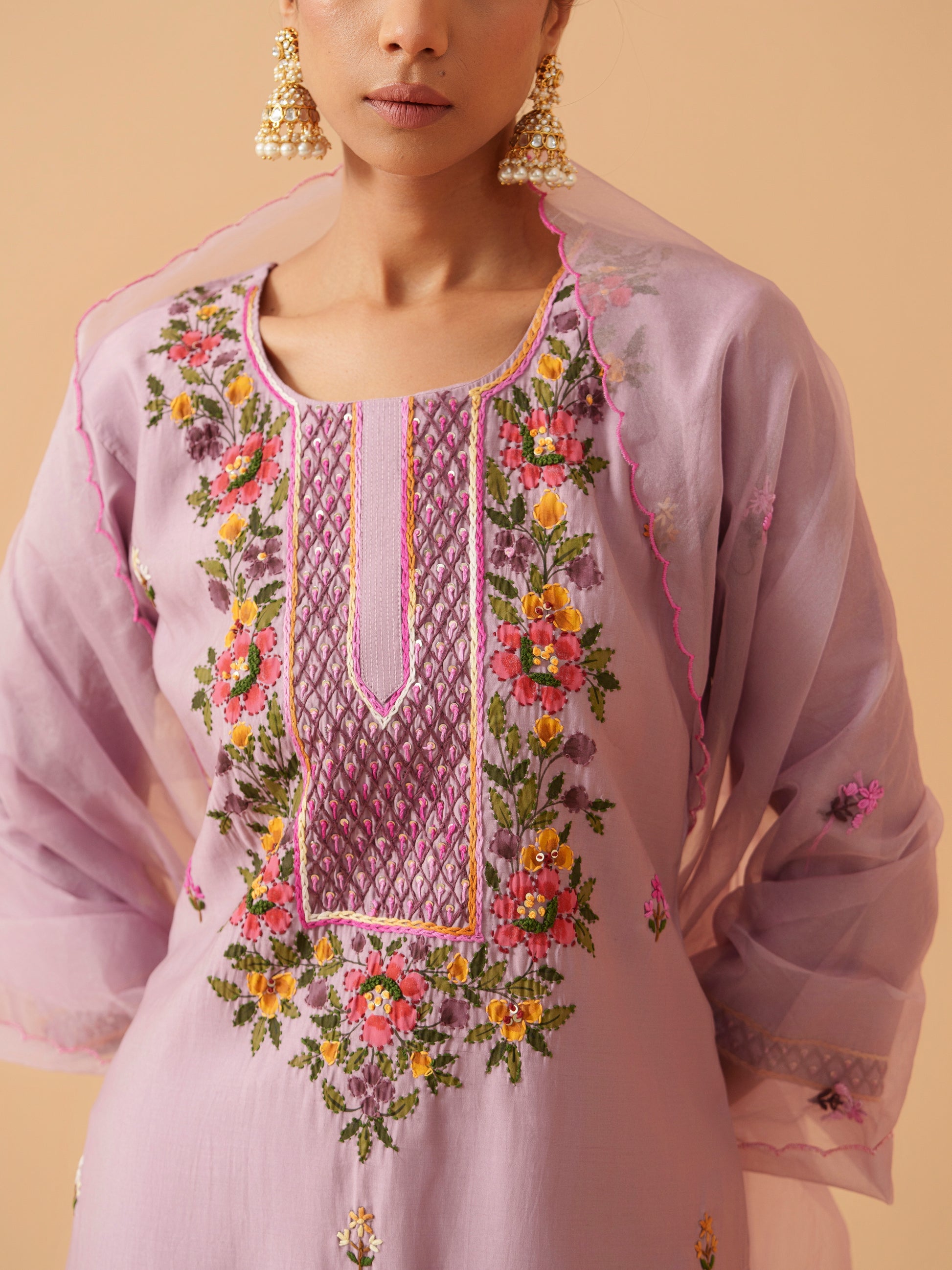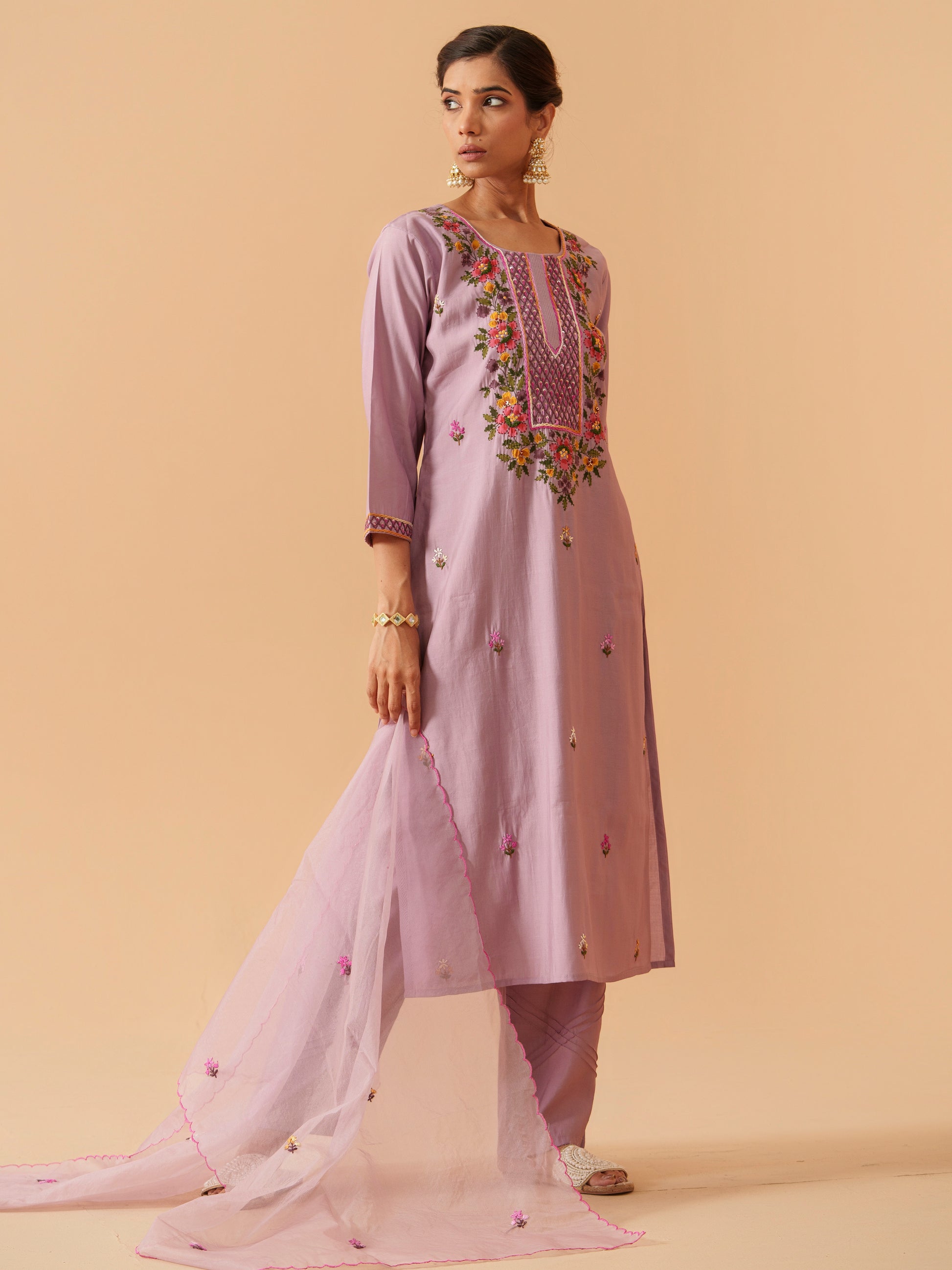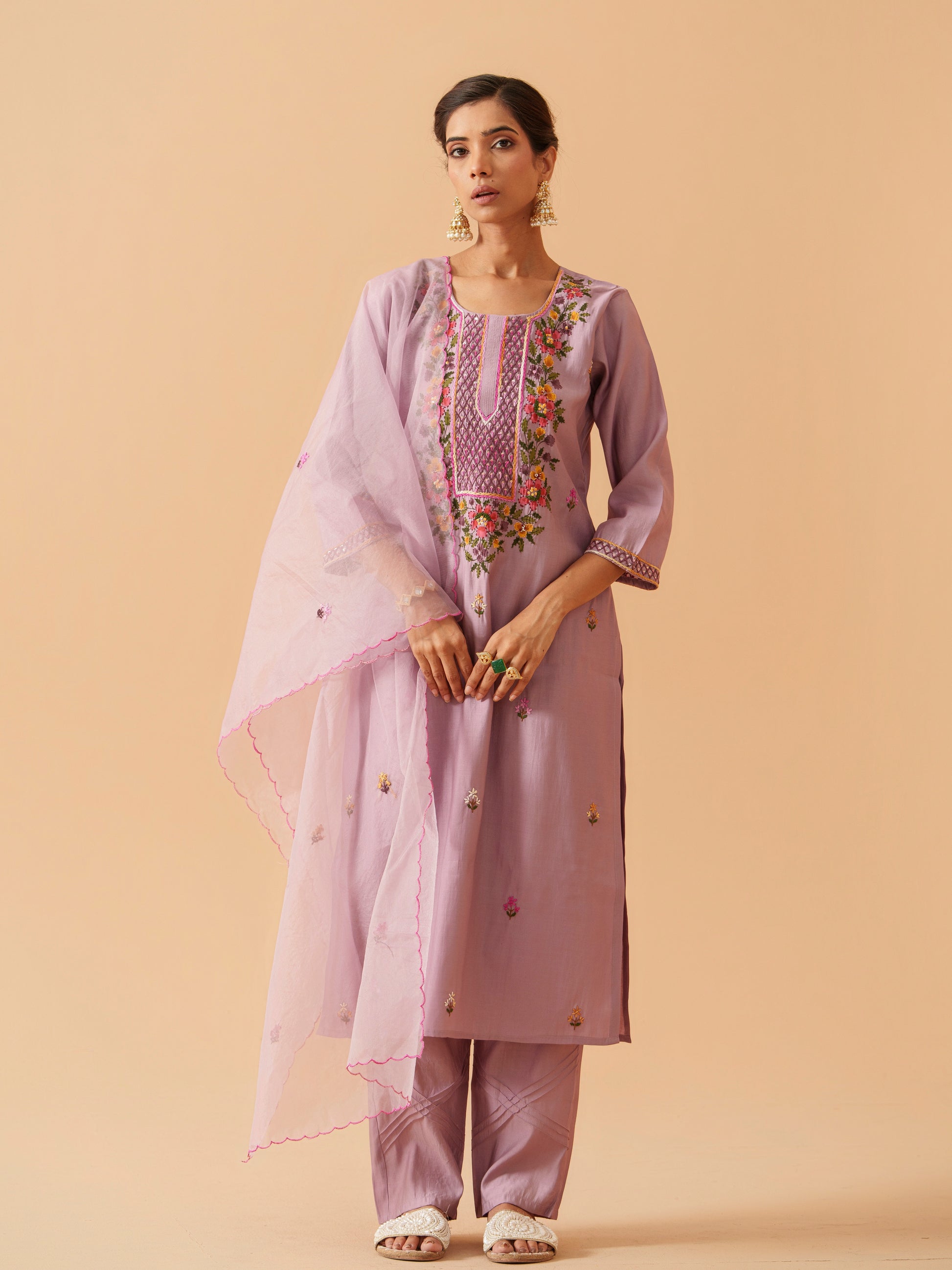 Floral Embroidered Straight Kurta With Trousers And Dupatta