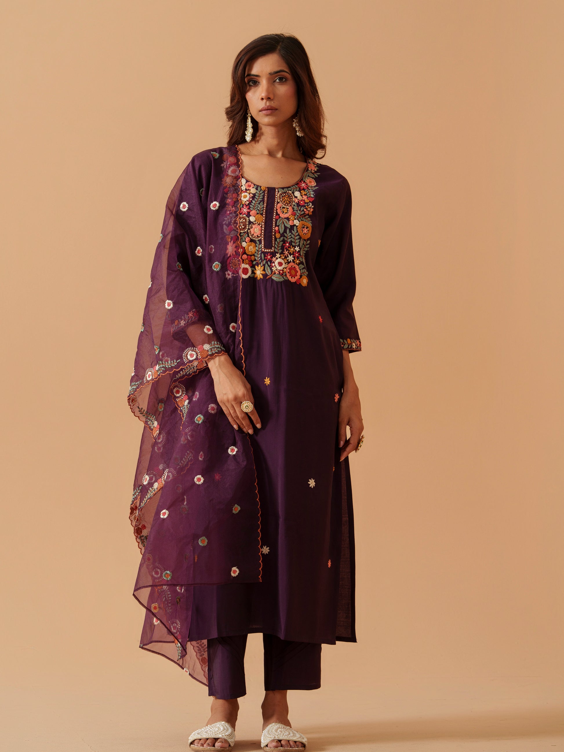 Floral Embroidered Straight Kurta With Trousers And Dupatta
