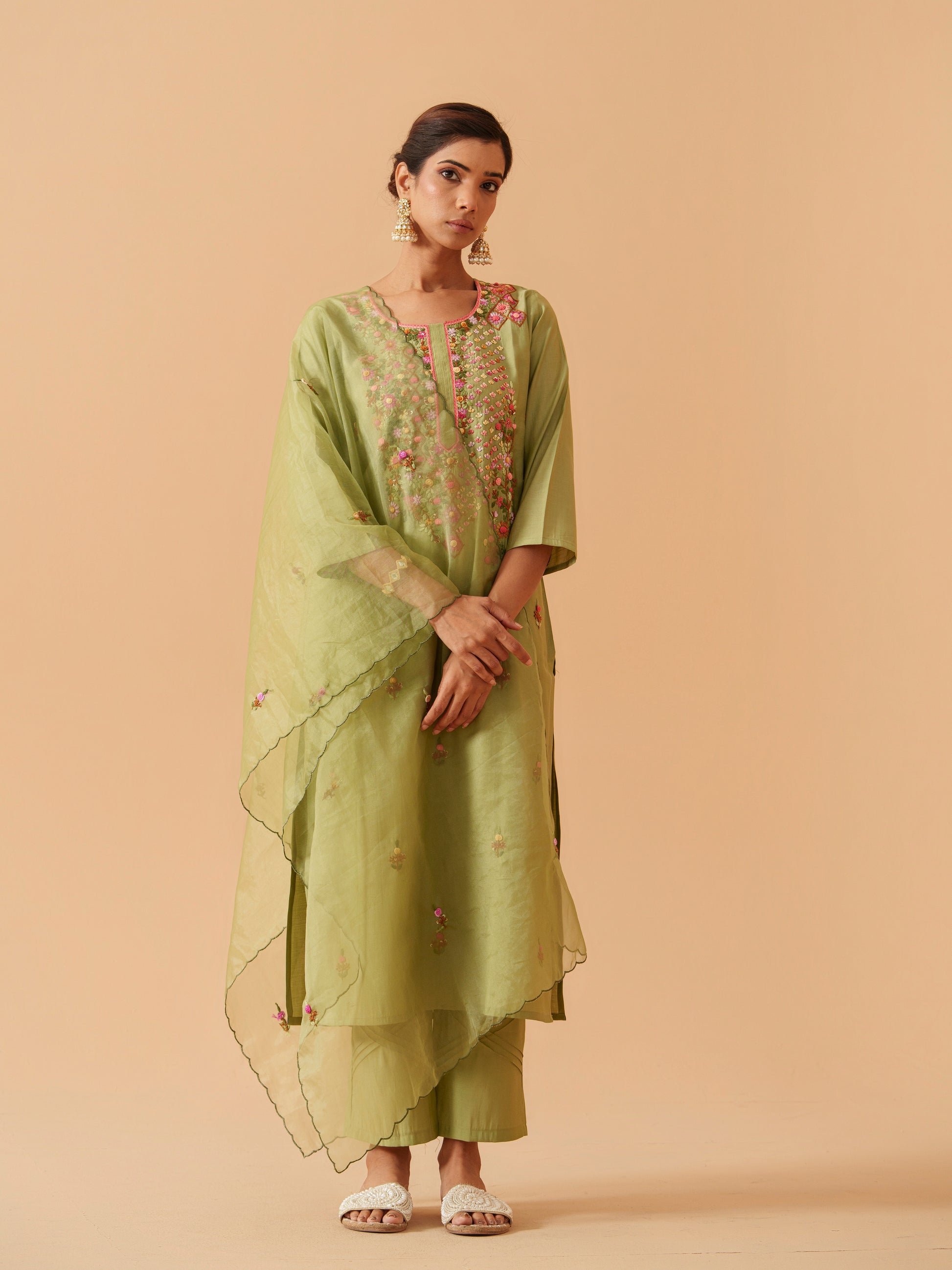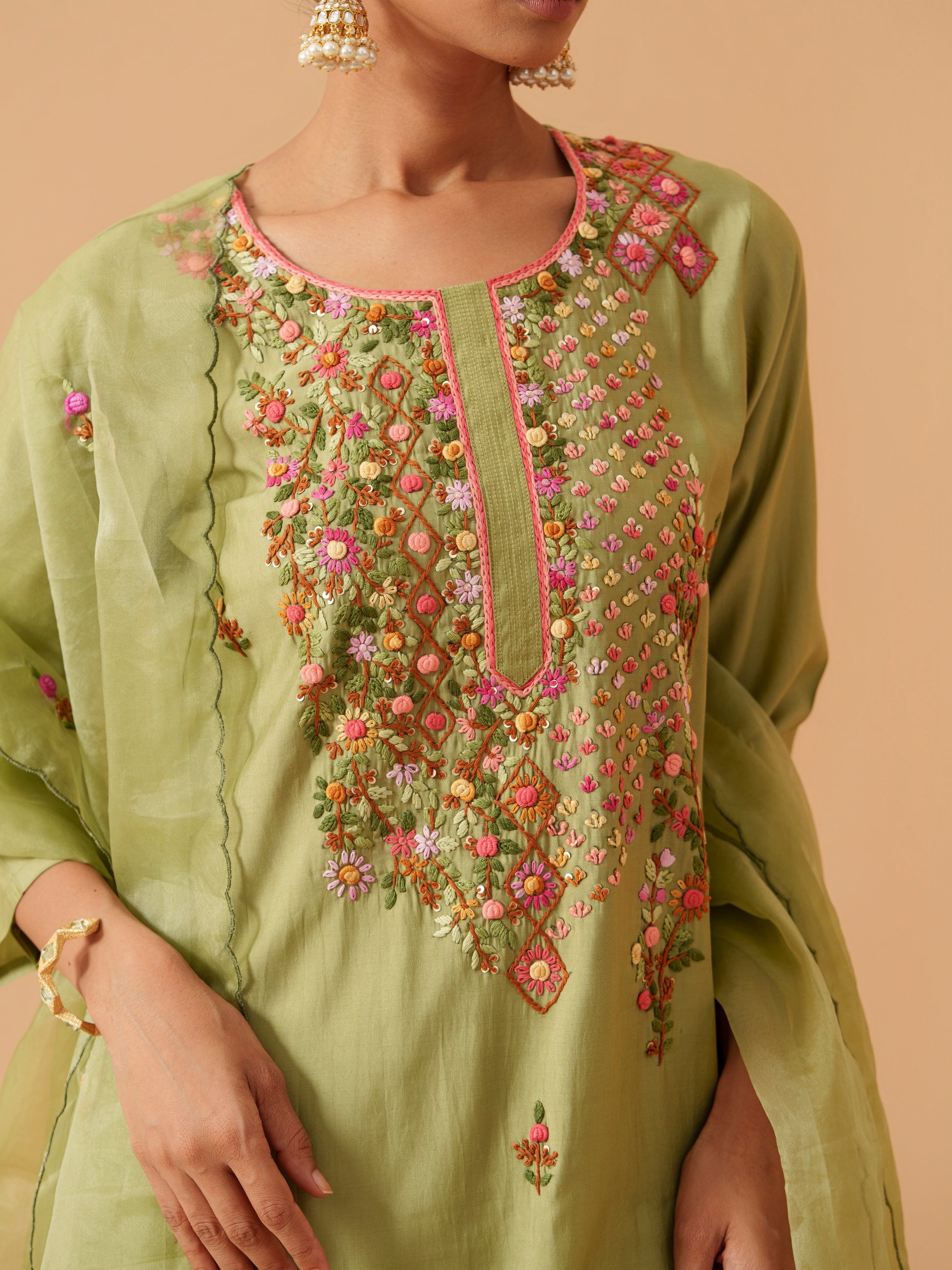 Floral Embroidered Straight Kurta With Trousers And Dupatta