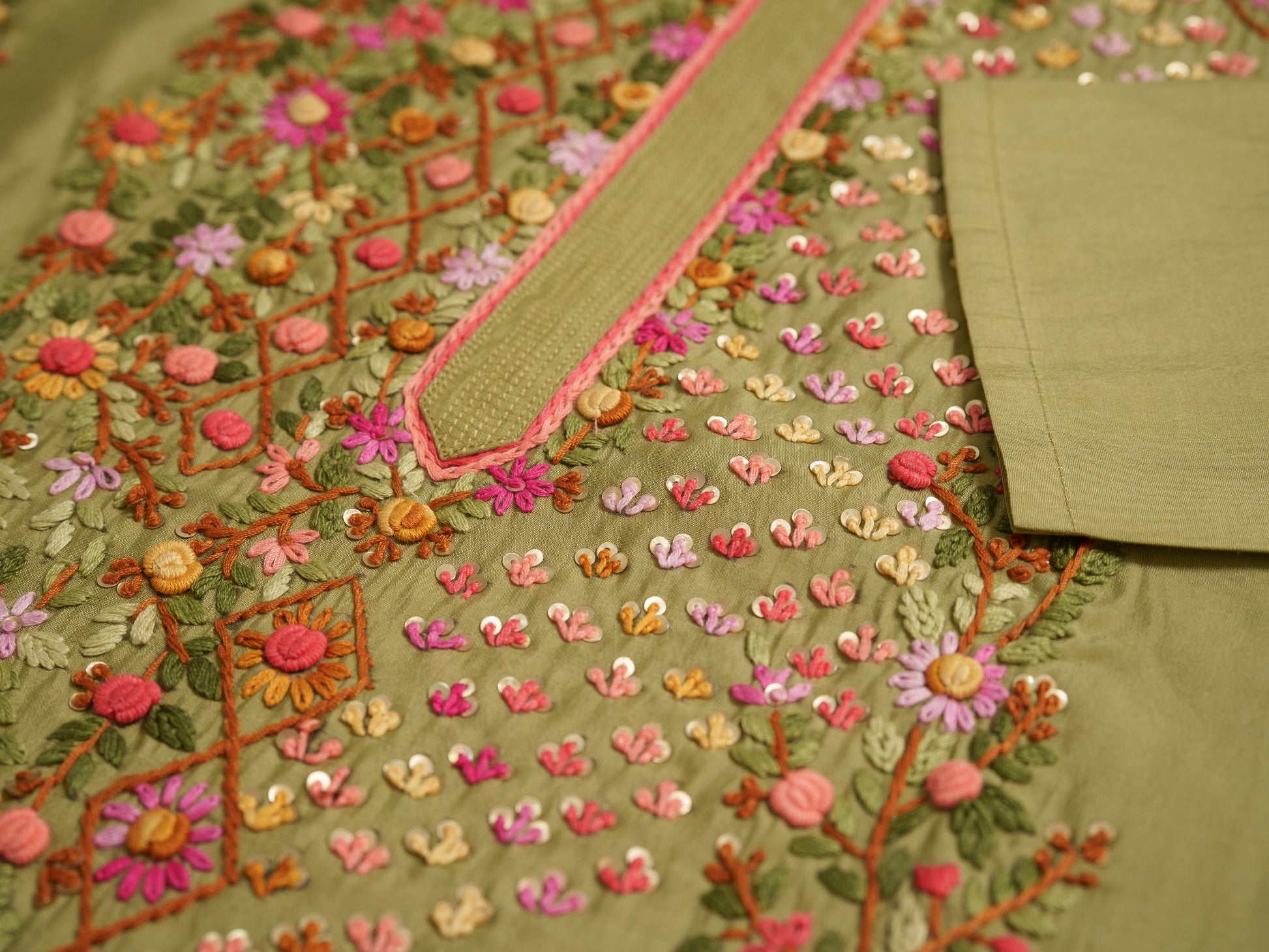 Olive Embroidered Woven Design Straight Kurta and Trousers With Dupatta