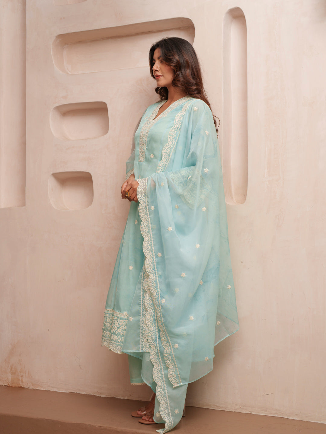 The outfit features delicate thread embroidery, subtle floral motifs, and beautifully detailed lace borders, giving it a graceful and timeless appeal