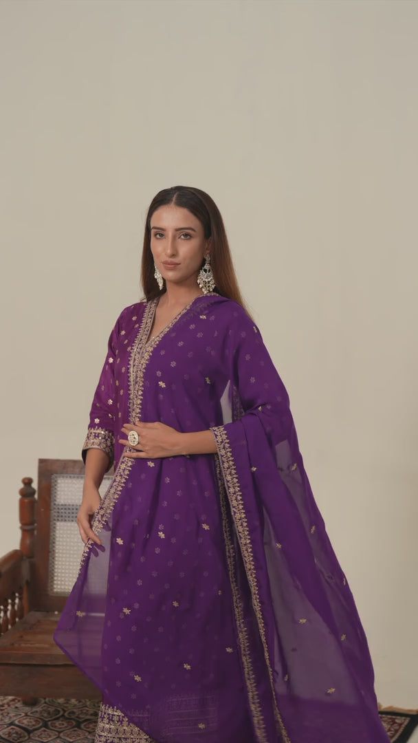 Poly Organza Purple Color Ethnic Motifs Embroidered Kurta With Trousers & Dupatta