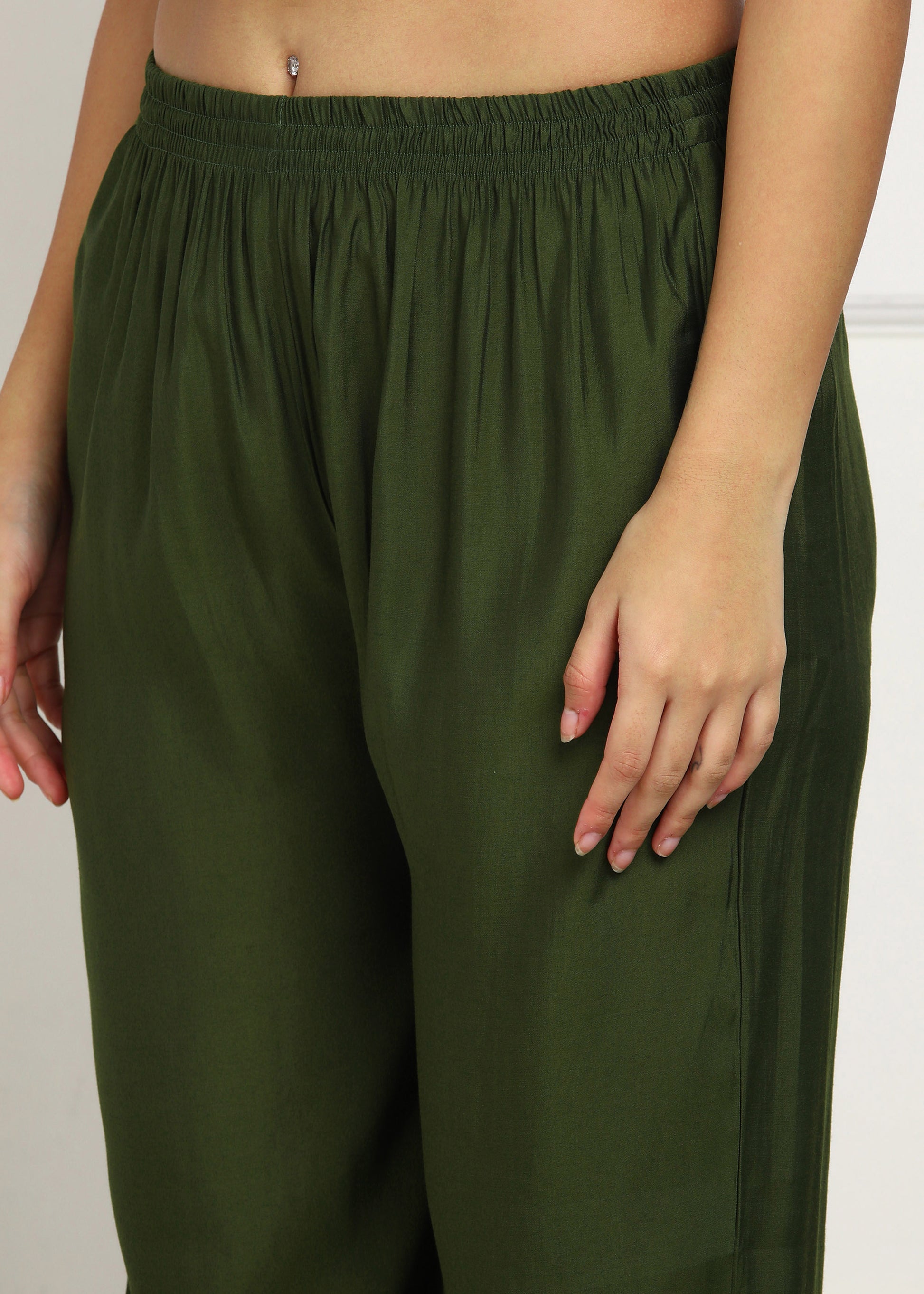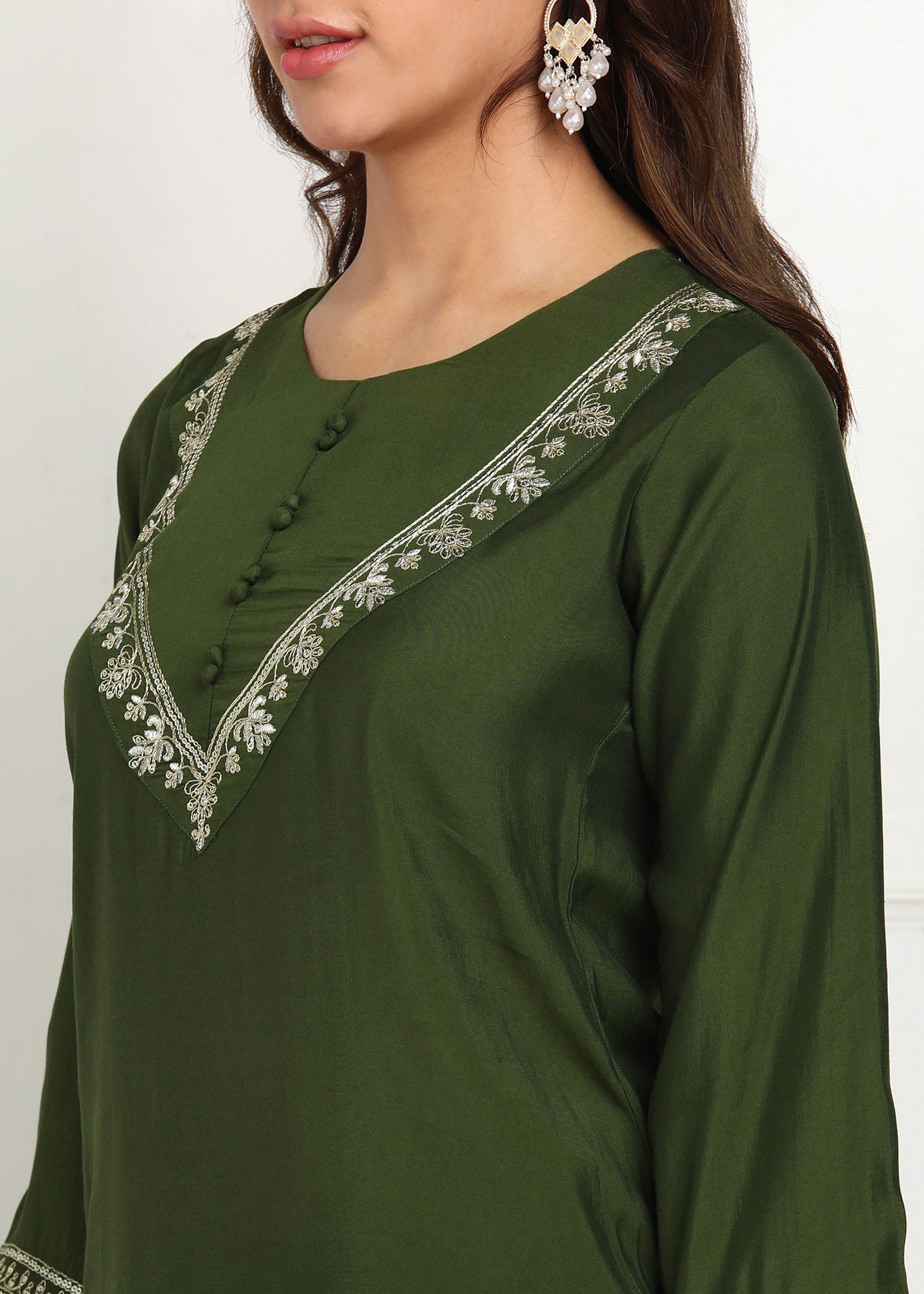 Elevate your ethnic style with this green co-ord's.The kurta features delicate embroidery along the neckline and sleeve edges, paired with straight-fit pants adorned with embroidered detailing at the hemline.