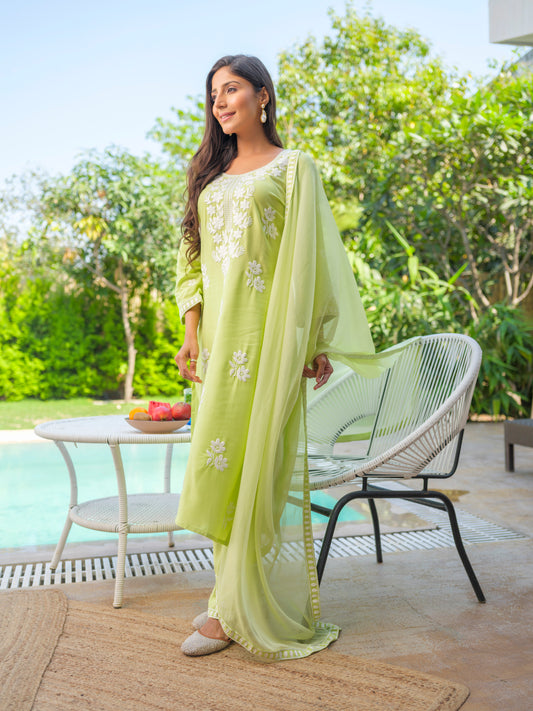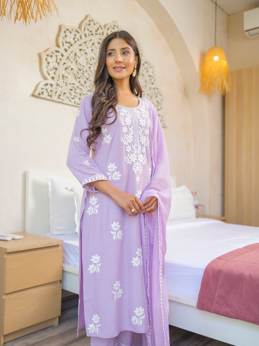 Floral Embroidered Straight Kurta With Trousers And Dupatta