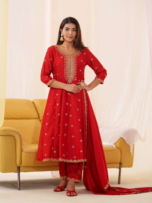 Floral Printed Thread Work Art Silk A-Line Kurta With Trouser & Dupatta