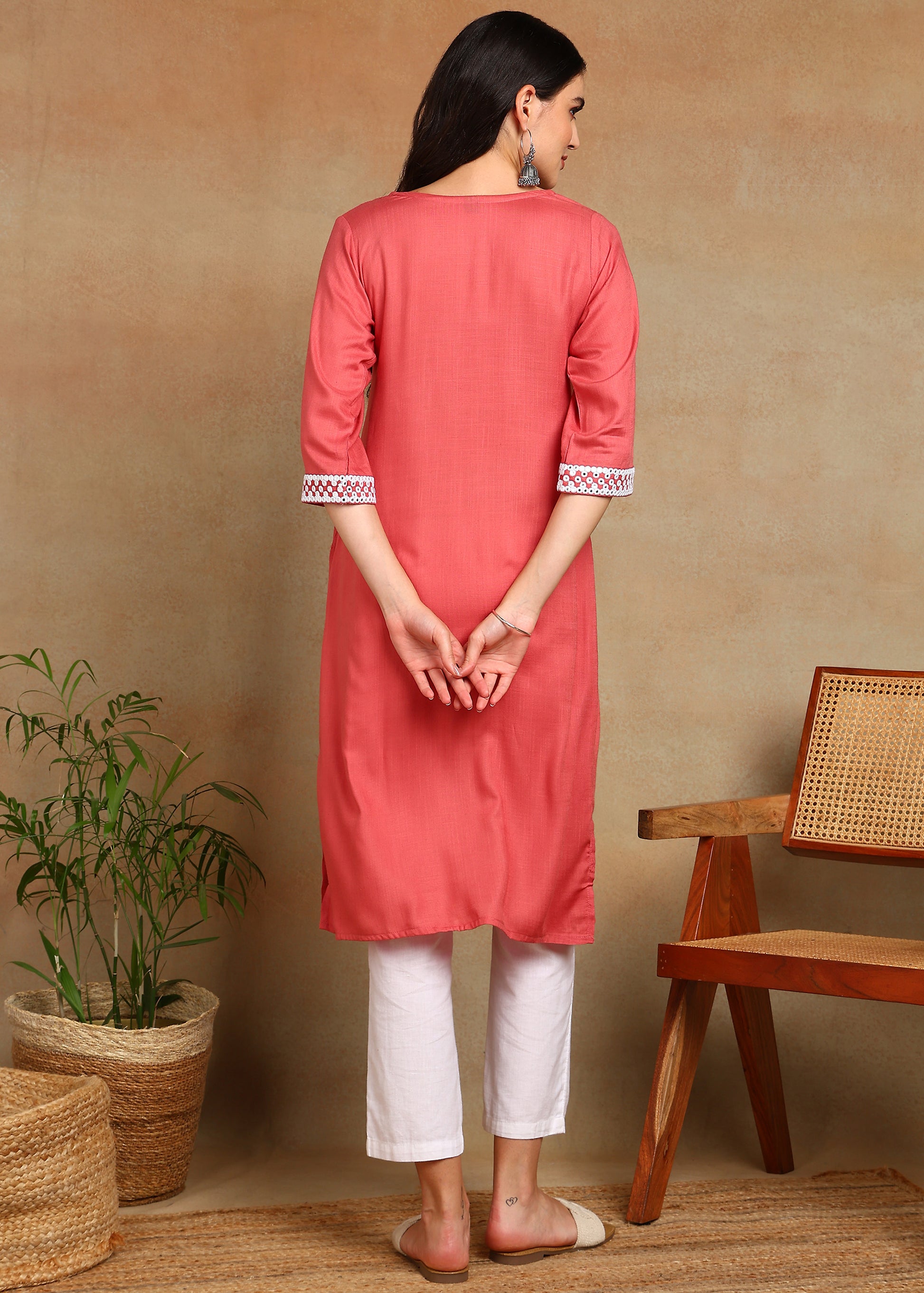 Peach Rayon Slub Kurti with White Embroidered Lace Detailing