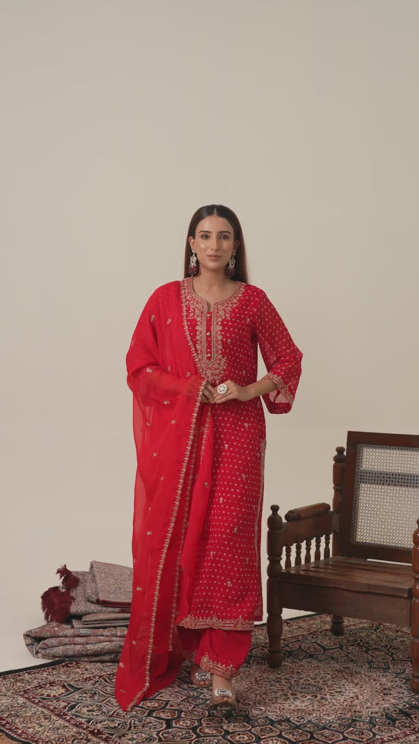 Poly Organza Red Color Floral Embroidered Organza Straight Kurta With Trousers & Dupatta