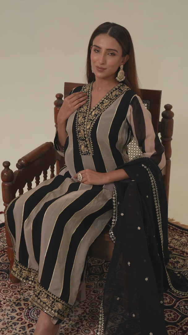 Black, grey & beige kurta Striped V-neck Three-quarter, regular sleeves Thread work details Straight shaped Calf-length with straight hem Machine weave regular organza fabric